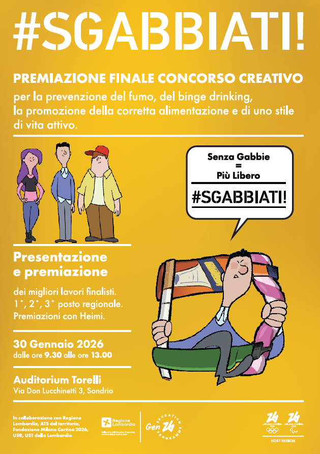 In quest’ottica, Regione Lombardia, in collaborazione con le ATS territoriali, promuove #Sgabbiati, un concorso rivolto alle scuole secondarie di primo e secondo grado per sensibilizzare i giovani sui temi della prevenzione, con particolare attenzione: